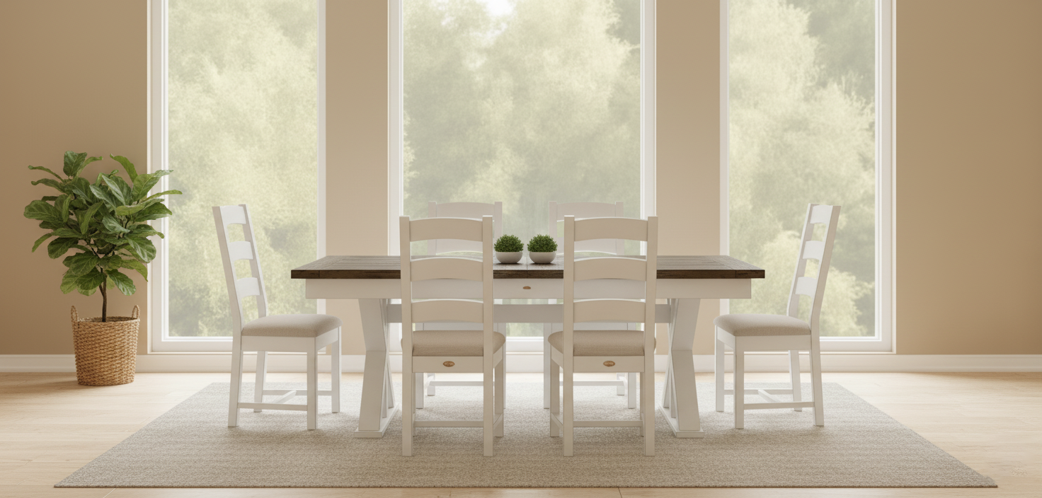 Rustic Timber Collection Medium Brown 36" x 65" with Linen Wood x Base and 4 Ladderback chairs with Linen frames and cushion seats
