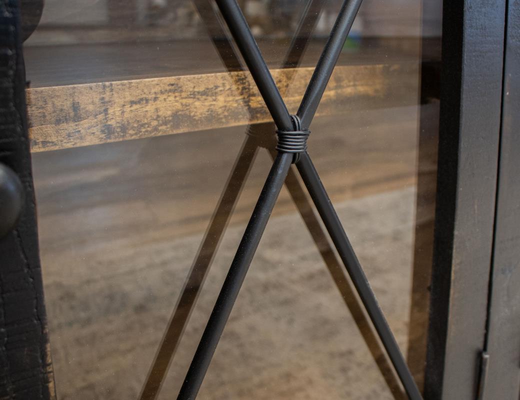Embrace timeless elegance with our Vintage Console, adorned with intricate metal detailing on its glass doors and finished in a striking weathered black. Enhanced by its distinctive bun feet, this console is a true embodiment of sophistication.